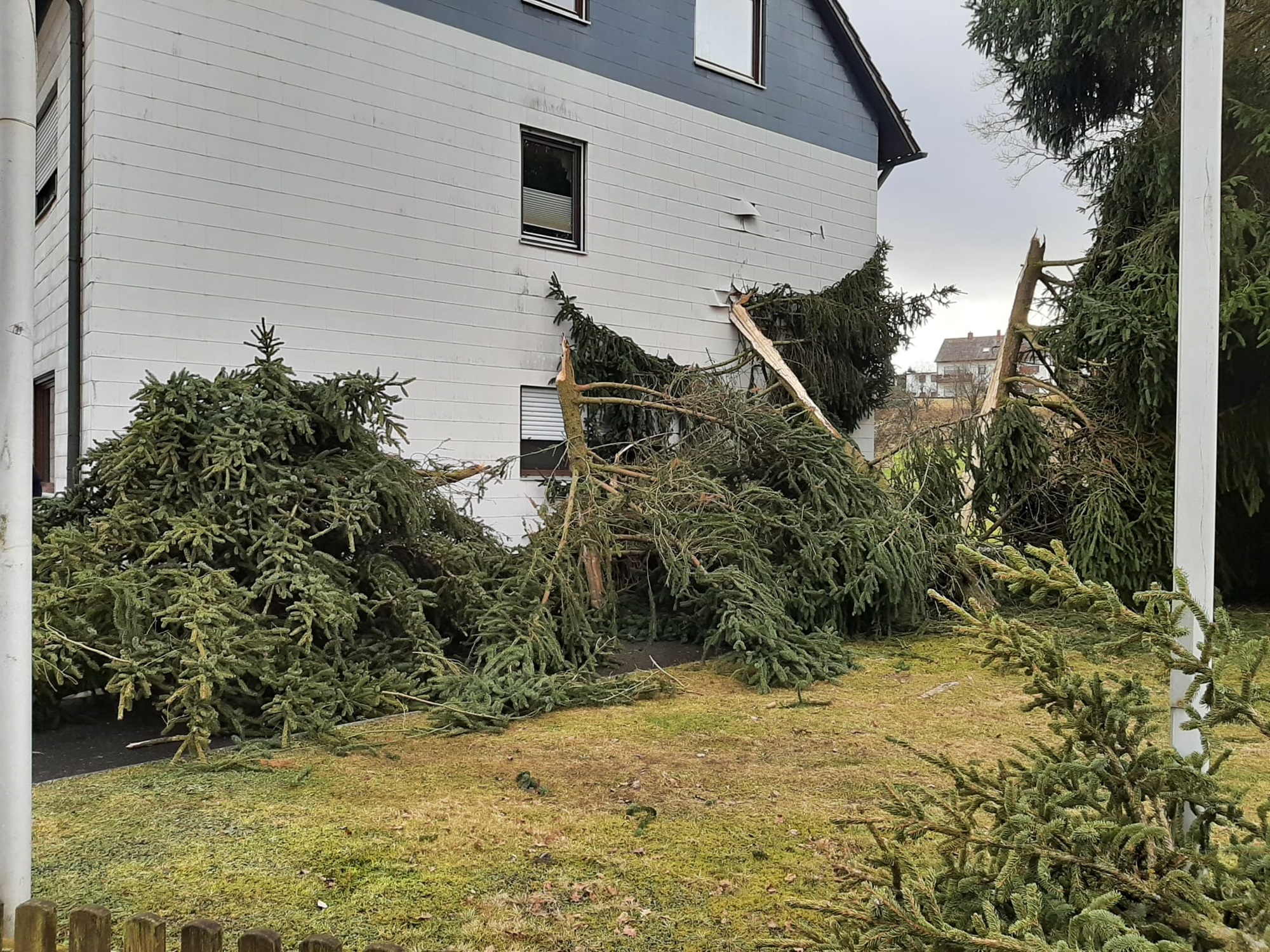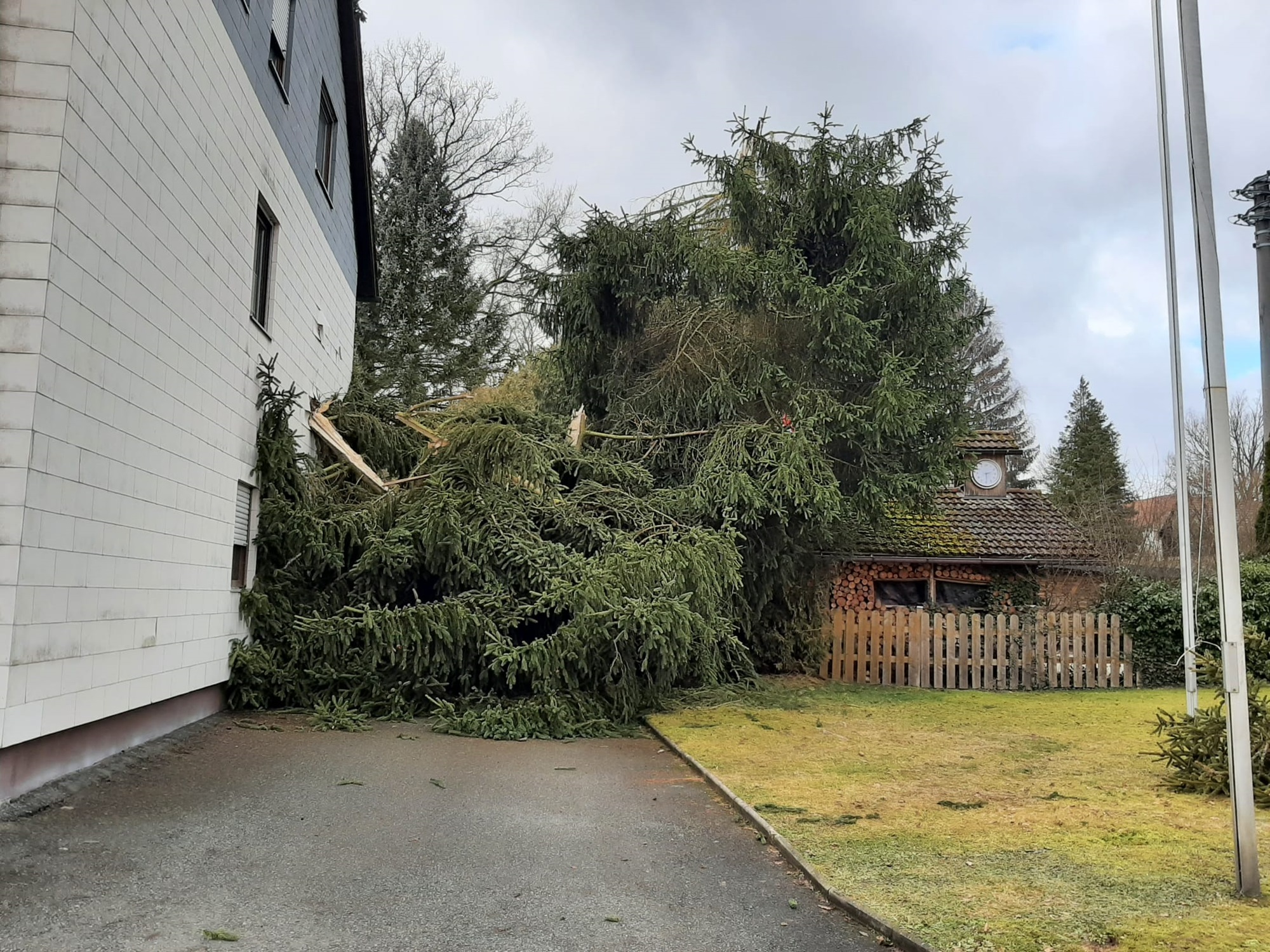 Vor Ort lag ein umgestürzter Baum auf einer Hausfassade und beschädigte diese dadurch.