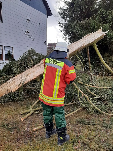 Mithilfe der Seilwinde des Rüstwagens, zogen wir den Baum auseinander und zerkleinerten ihn anschließend mit einer Motorsäge.