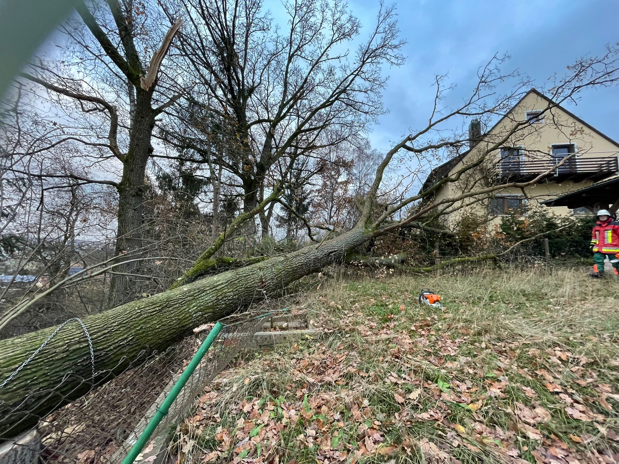 Die Feuerwehr Creußen wurde zu einem Gebäude innerhalb der Stadt alarmiert. Bei Baumfällarbeiten war ein Baum gegen ein Wohnhaus gefallen. Wir beseitigten den Baum mittels Motorsäge Stück für Stück, um weitere Schäden am Gebäude zu vermeiden und die Gefahr für die Bewohner zu beseitigen.