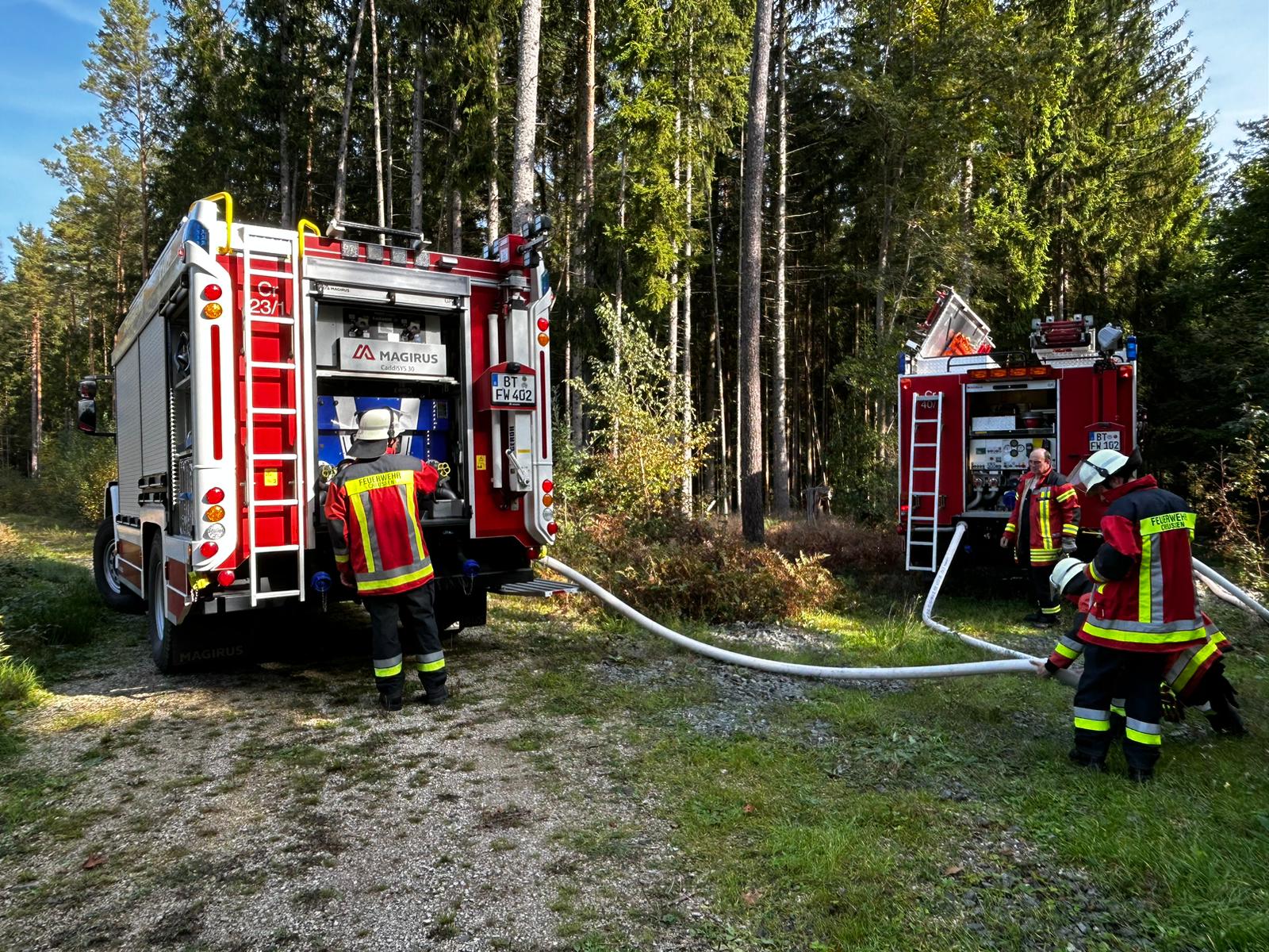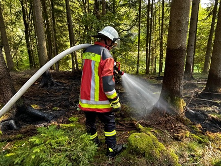 Hier wurde durch die Bayerischen Staatsforsten eine ca. 60 m² brennende, schlecht zugängliche Fläche Waldboden und Unterholz entdeckt.