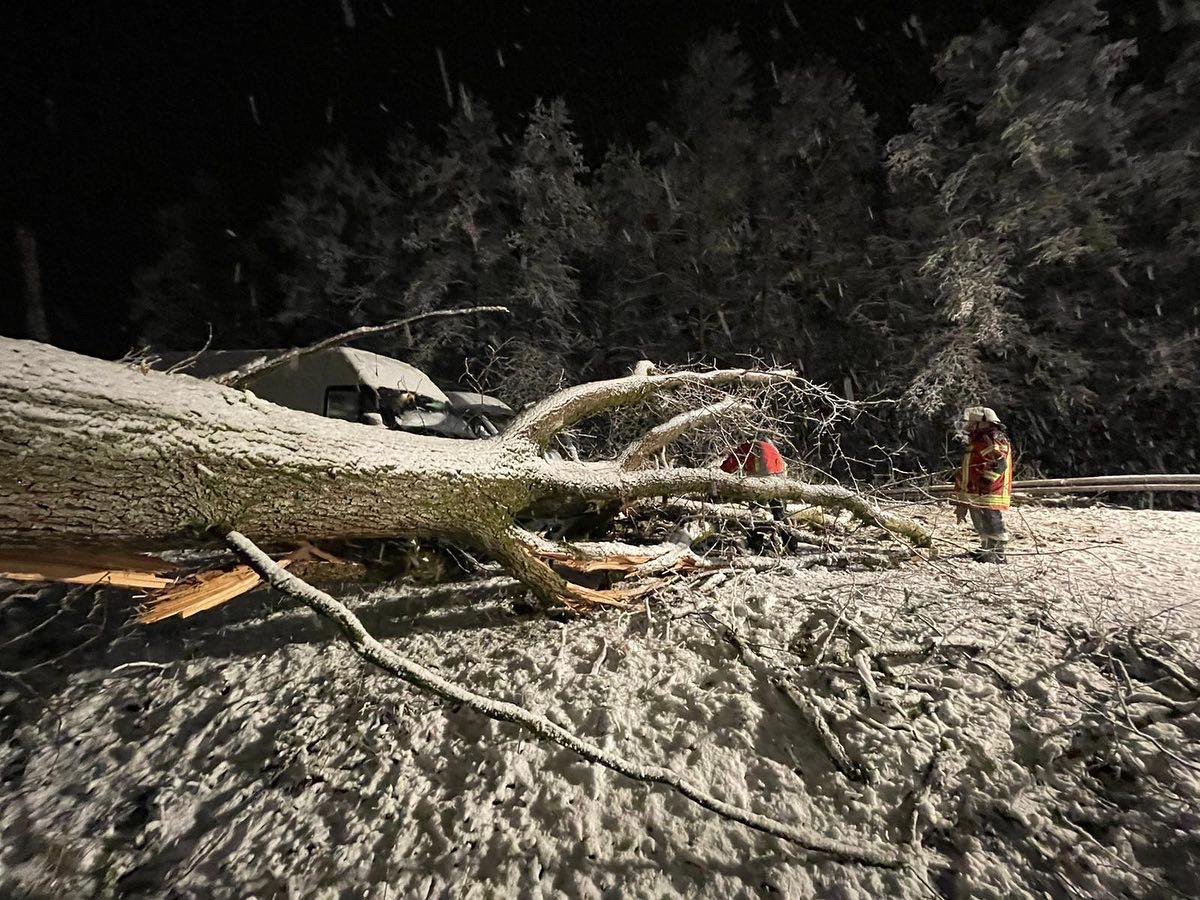 An der Einsatzstelle lag ein massiver Baum über der Fahrbahn. Zudem hingen zwei Transporter fest.