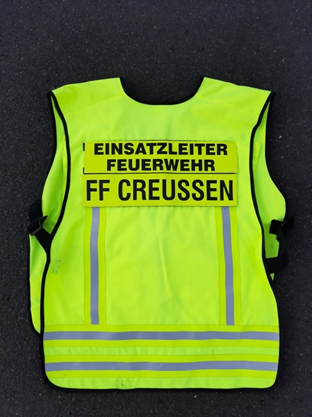 Der Einsatzleiter trägt eine gelbe Weste die mit "Einsatzleiter Feuerwehr" gekennzeichnet ist.